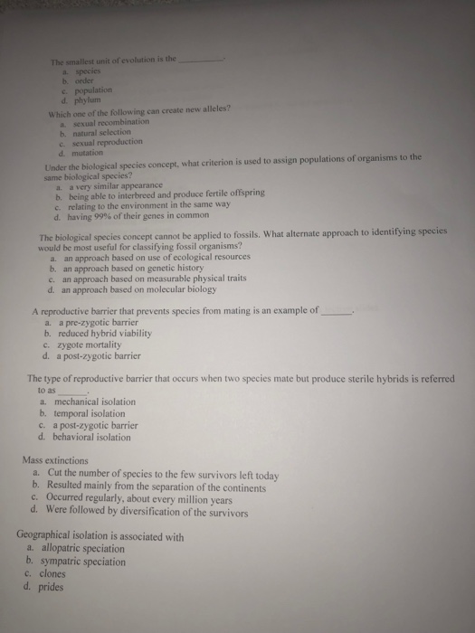 The smallest unit of evolution is the a. species b. | Chegg.com